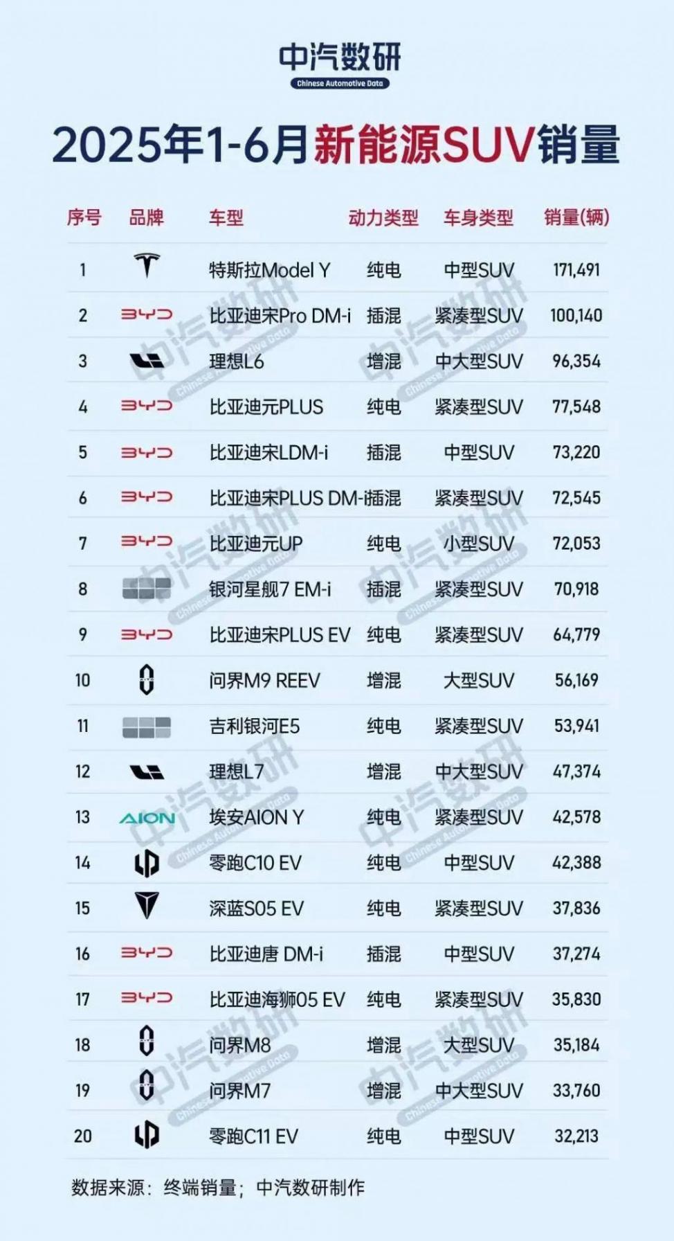 今年上半年,新能源SUV銷量TOP20中,沒有一款是中大型純電SUV。