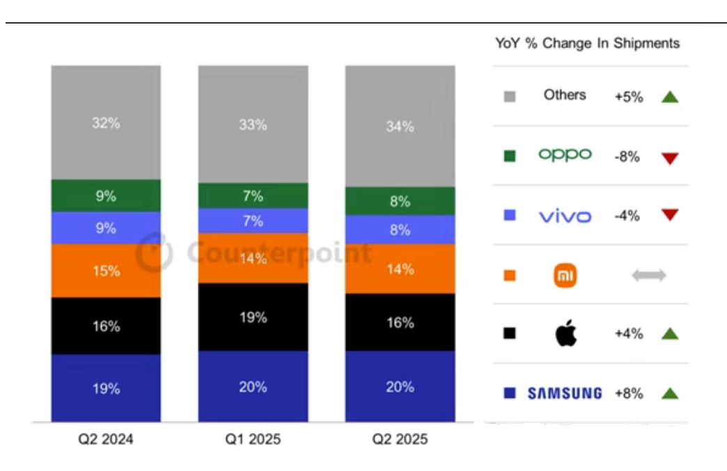 如上圖所示,這是Counterpoint發布的2025年Q2全球智能手機市場報告。