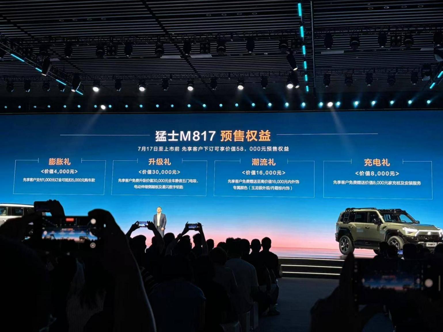 2025年7月17日晚間,東風(fēng)汽車旗下豪華電動(dòng)越野品牌猛士科技全新車型猛士M817正式開(kāi)啟預(yù)售,新車推出Pro、Max兩款配置,預(yù)售價(jià)分別為32.99以及35.99萬(wàn)元,同時(shí)猛士科技還推出4項(xiàng)預(yù)訂權(quán)益,綜合價(jià)值5.8萬(wàn)元,詳見(jiàn)下圖: