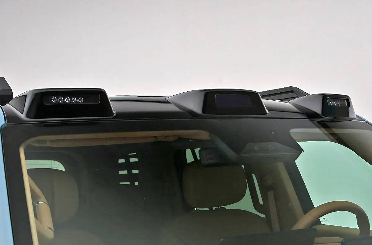 前大燈組在設(shè)計(jì)上沒(méi)有復(fù)雜的型面處理,整體造型依車頭線條走向順勢(shì)鋪就。猛士M817的車頂兩端各有一盞LED探照燈,可在越野使用場(chǎng)景中為車輛提供更好的照明效果。