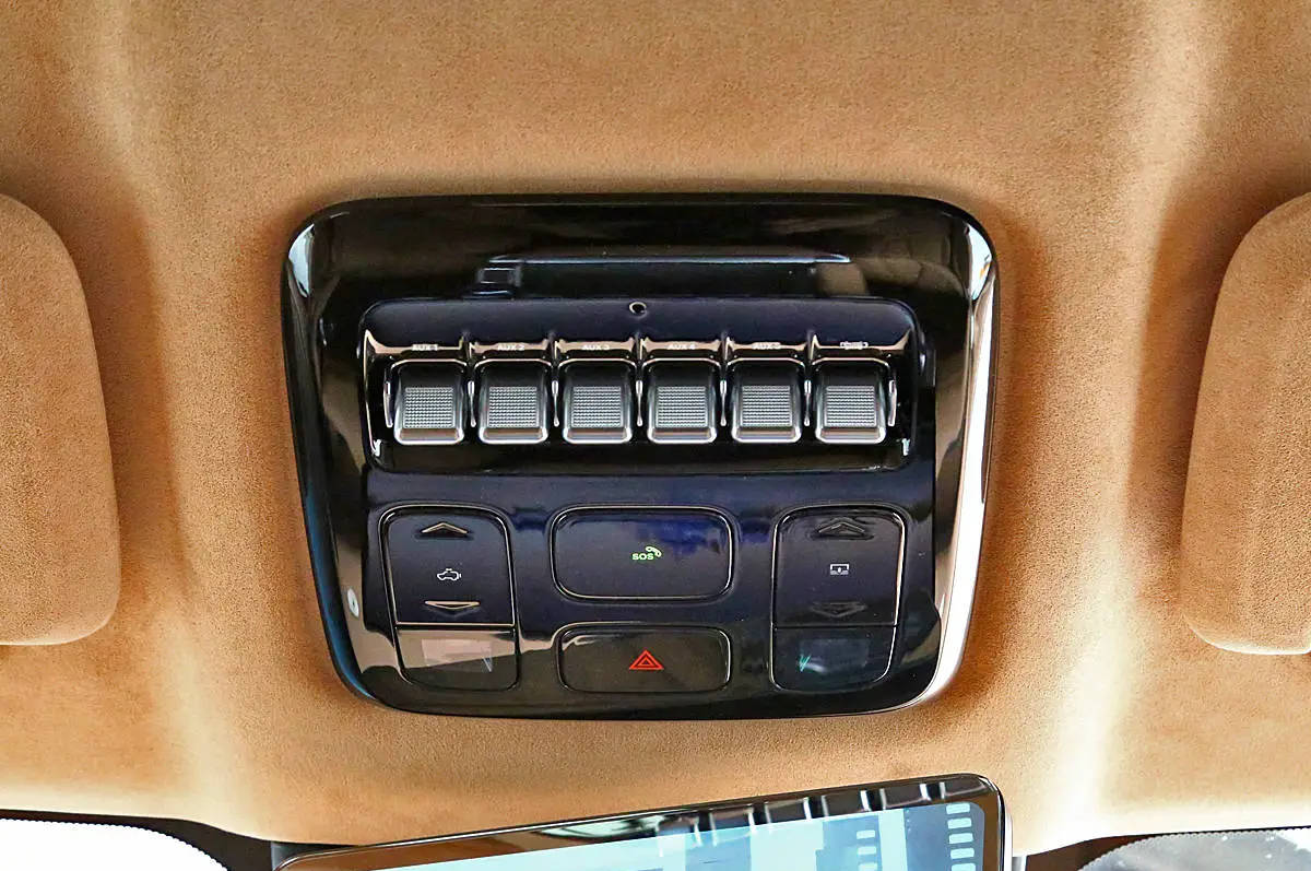 前排頂棚上還提供有一排共計(jì)六個(gè)飛航式實(shí)體控制鍵,并與前車頂燈集成一體,方便駕駛員操作;特別是6個(gè)AUX頂置開(kāi)關(guān)對(duì)應(yīng)預(yù)留電源接口,方便用戶后期進(jìn)行個(gè)性化改裝。