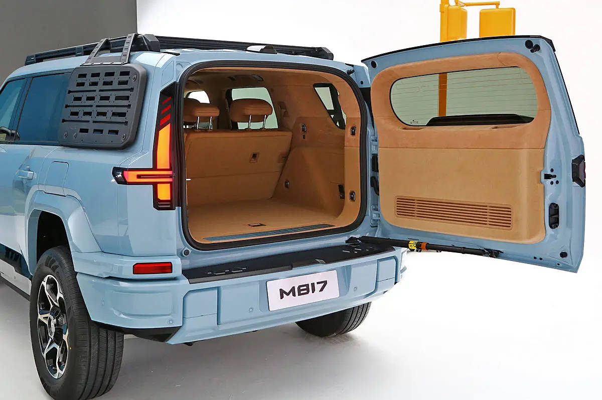 M817車身側(cè)面的姿態(tài)延續(xù)了猛士家族化的設(shè)計(jì),腰線采用雙段式肌理設(shè)計(jì),A柱的傾角還特別針對(duì)風(fēng)阻系數(shù)進(jìn)行了優(yōu)化。針對(duì)越野使用場(chǎng)景,猛士M817不但支持安裝諸如側(cè)窗支架、側(cè)爬梯等外設(shè)裝備。在空間表現(xiàn)方面,車身長(zhǎng)寬高尺寸分別為5100mm*1998mm*1919mm(空氣彈簧版)/1899mm(螺旋彈簧版),軸距為3005mm。