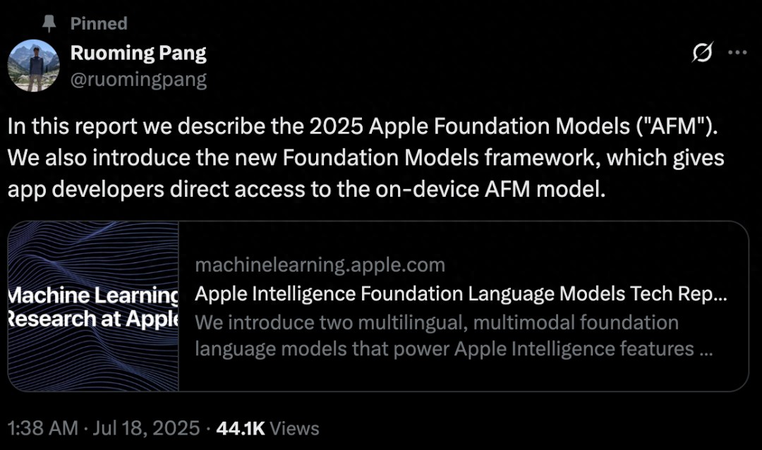 蘋果公司近日正式發布了《Apple Intelligence Foundation Language Models Tech Report 2025》技術報告,這是繼去年首次公開其 AI 基礎模型技術細節后的重要更新。而且,就在不久前 Meta 剛剛以數千萬美元薪酬挖走了蘋果基礎模型團隊負責人龐若鳴(Ruoming Pang),這份技術報告很可能是龐若鳴在蘋果生涯的最后一份重要成果。