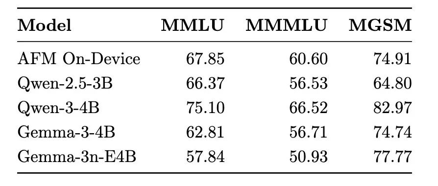 性能評估的結果顯示,在 MMLU 等標準測試中,蘋果的端上模型表現優于或持平于 Qwen-2.5-3B、Gemma-3-4B 等同規模的開源模型。