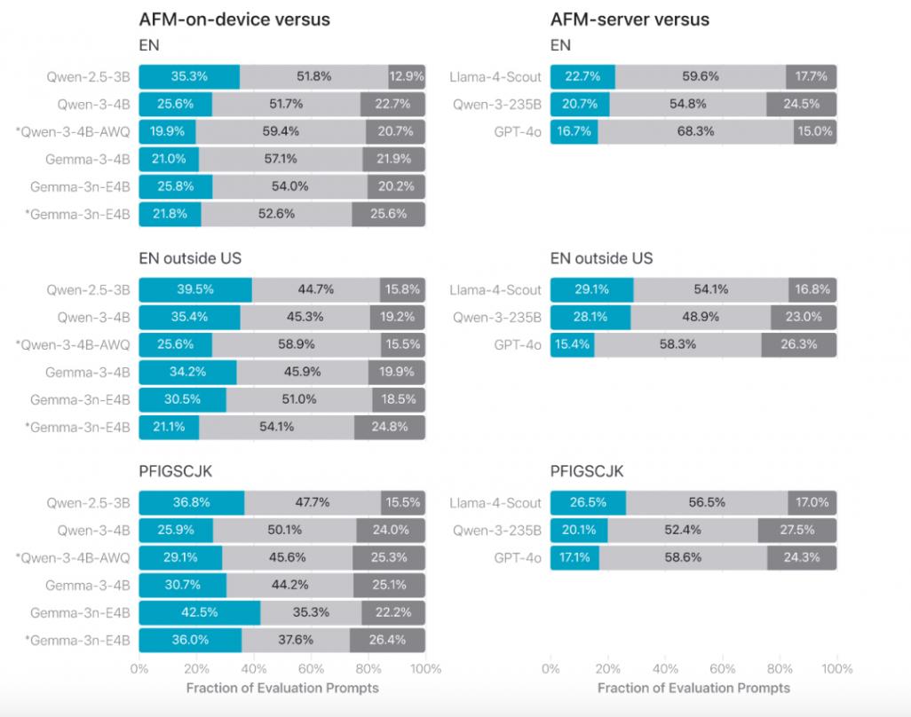 服務器模型則在與 LLaMA 4 Scout 的對比中表現出色,但與 Qwen-3-235B 和 GPT-4o 等更大規模的模型相比仍有差距。在與人類評分員進行的并排比較中,蘋果的模型在多個語言區域和任務中的表現都較為突出。