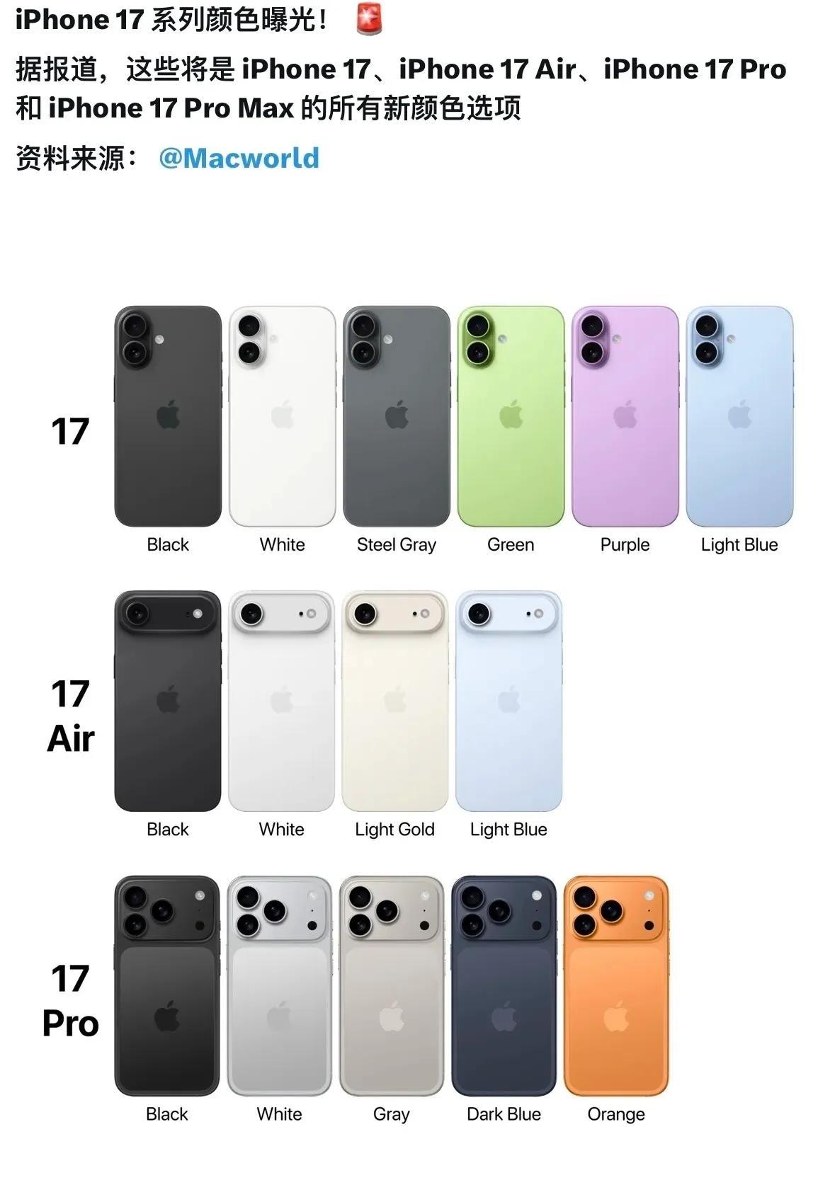 iPhone 17系列新配色全面曝光,離發布會不到兩個月,各方面信息已經漸漸清晰。這一次,蘋果不僅帶來了設計上的大膽調整,而且還有不少技術上的升級,尤其是在顏色和硬件配置上更是讓人眼前一亮。