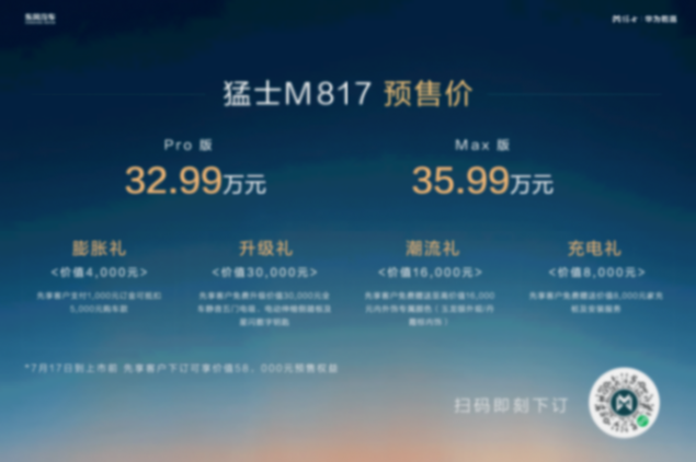 智野無界,城野隨心。7月17日,“風(fēng)華正猛——猛士M817技術(shù)發(fā)布暨新車預(yù)售”在武漢舉行。東風(fēng)猛士科技與華為聯(lián)合發(fā)布了專為猛士M817量身打造的“豪華智能越野技術(shù)解決方案”,“全棧華為、全域通達(dá)、全維安全”三大硬核技術(shù)集群,盡展“鐵血猛士”與“滿血華為”的頂流實力,讓猛士M817成為“智能越野第一車”,成為“越野車中最智能、智能車中最越野”的豪華智能越野SUV?;顒由希褪縈817同步開啟預(yù)售,新車提供兩個版本,其中猛士M817 Pro版預(yù)售價32.99萬元,猛士M817 Max版預(yù)售價35.99萬元,即日起下訂可享價值58,000元限時預(yù)售權(quán)益。