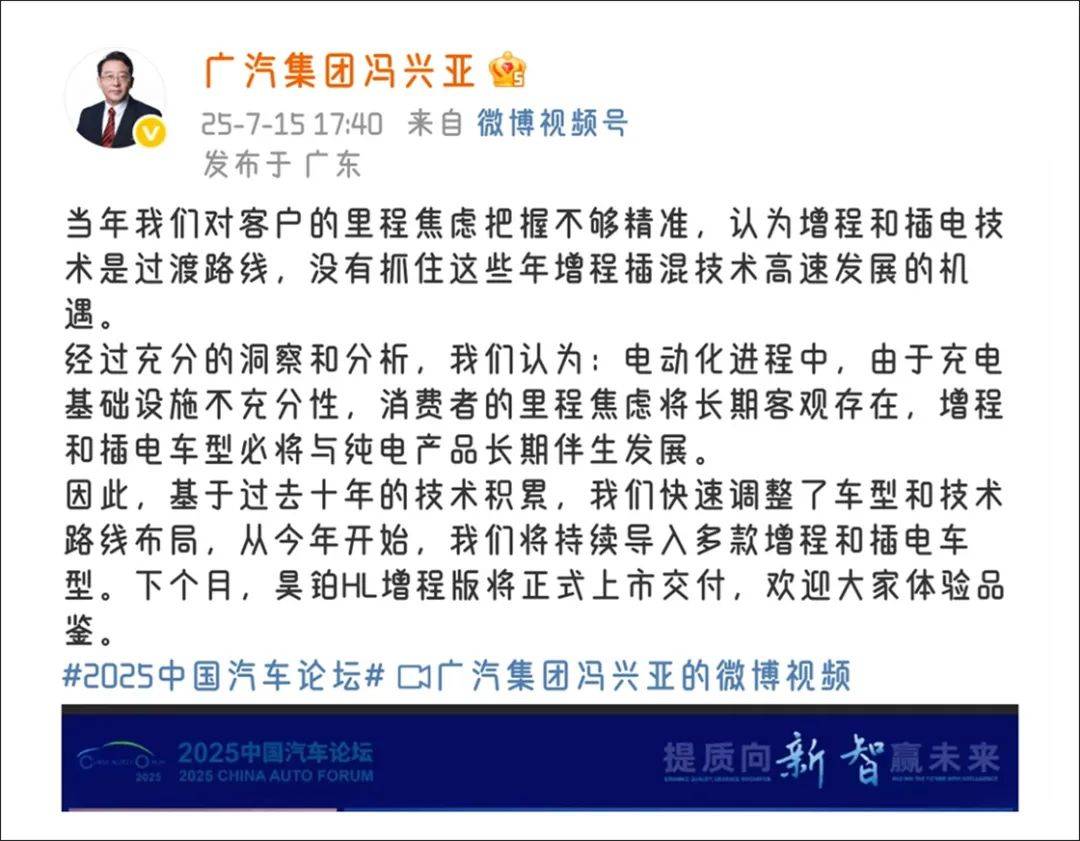 7月15日,馮興亞再度在社交平臺重提,反思了公司在新能源汽車領域的戰略布局,直言過去對客戶里程焦慮把握不準,未重視增程和插電技術,錯失了發展機遇。