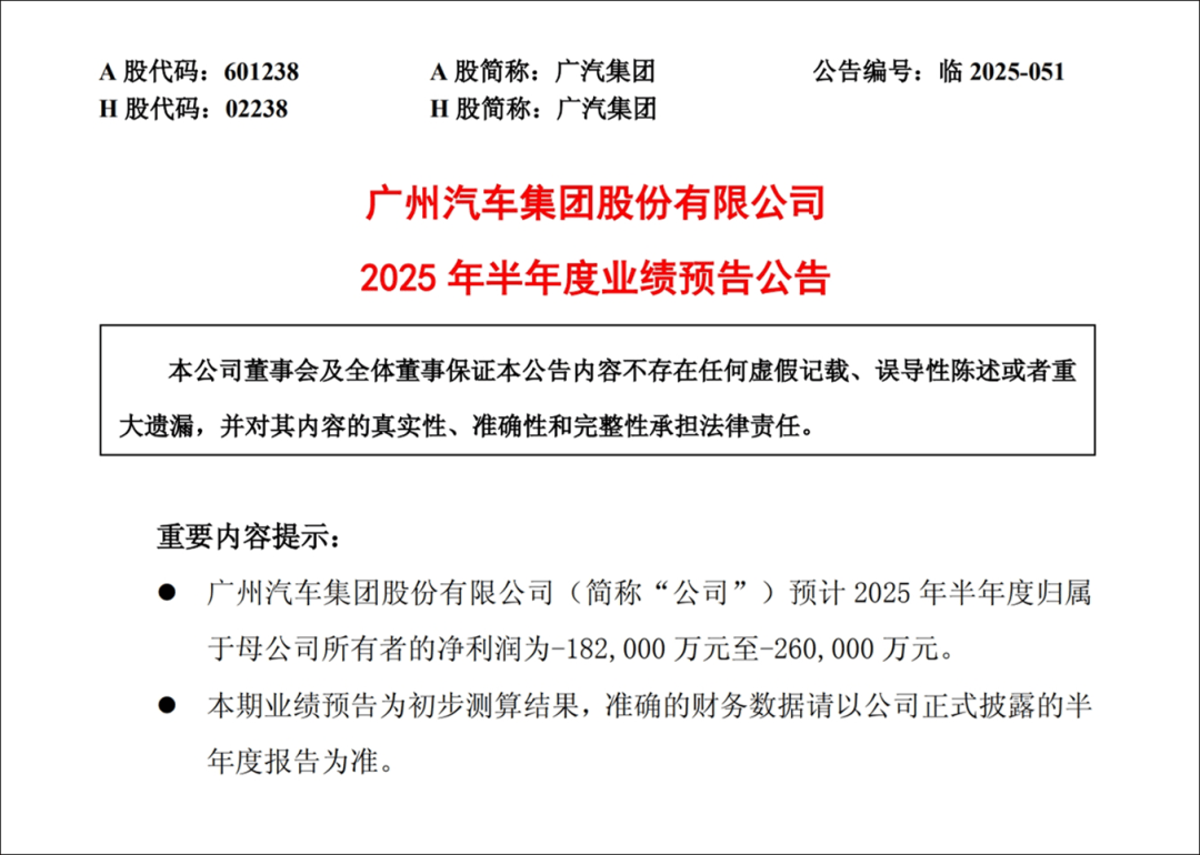 在集團新一輪的公告披露中,外界一度對廣汽現階段的收益很是緊張。“2025年上半年歸母凈虧損18.2億元-26億元”的預計收益,儼然將廣汽的經營現狀擺上了臺面。