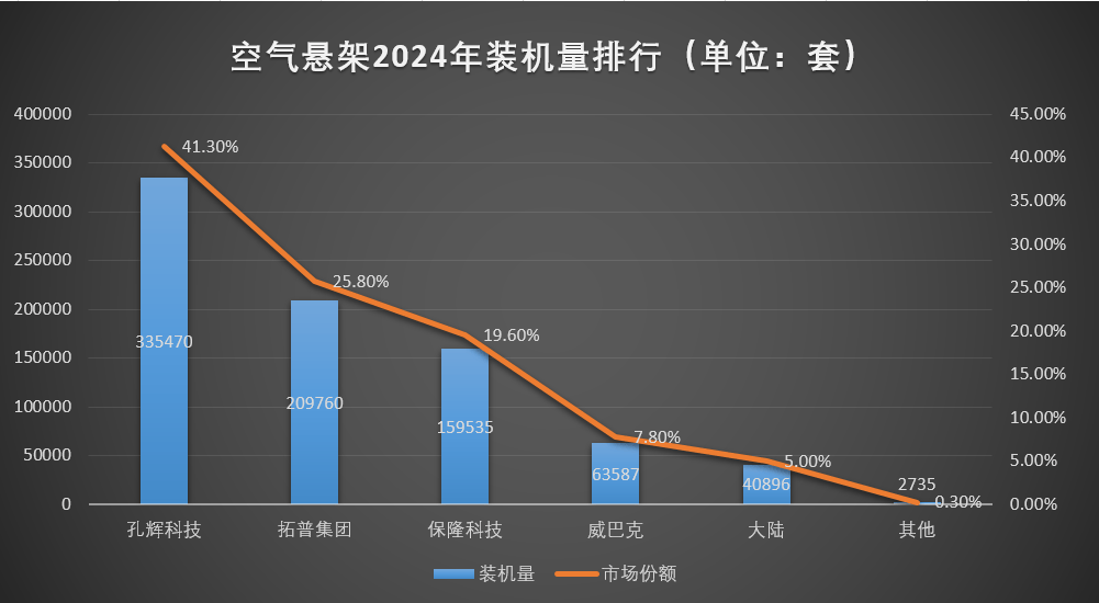 這三家是,孔輝科技以335470套的裝機(jī)量位居TOP1,占據(jù)41.3%的市場(chǎng)份額。拓普集團(tuán)的209760套、25.8%的市場(chǎng)份額,保隆科技的159535套、19.6%的市場(chǎng)份額,位居第二和第三。這也充分展示了自主廠商在空氣懸架領(lǐng)域不斷成長的競(jìng)爭(zhēng)力。