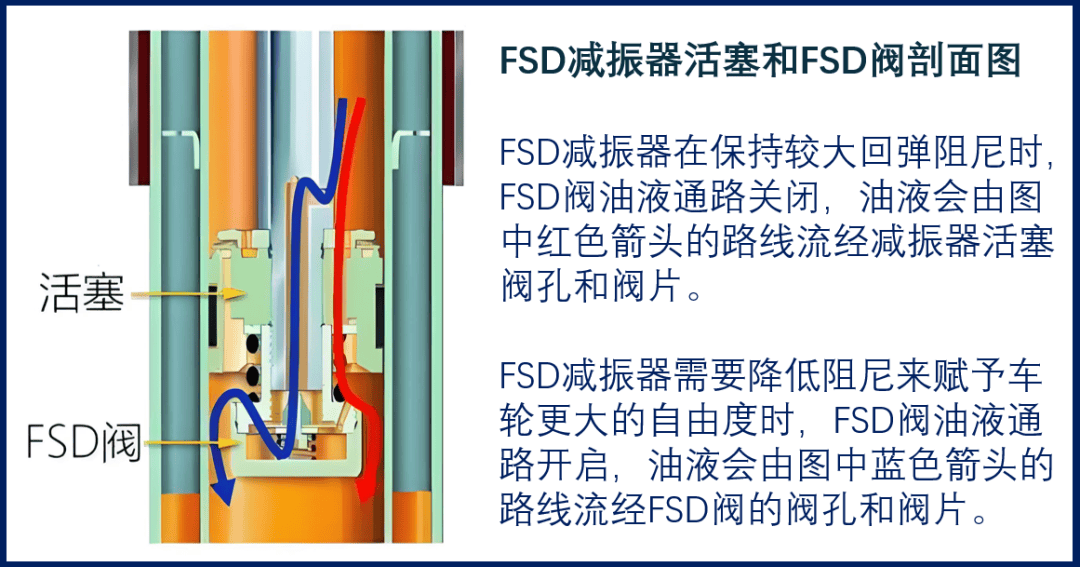 FSD(Frequency Selective Damping)翻譯過來叫自適應(yīng)調(diào)整減振器,是在常規(guī)減振器固定式閥門的基礎(chǔ)上,多一個(gè)FSD閥和油路通道。當(dāng)汽車正常行駛時(shí),由于懸架是低頻振動(dòng),F(xiàn)SD閥會(huì)關(guān)閉,相當(dāng)于是個(gè)常規(guī)減振器。