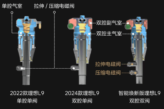 而從數(shù)據(jù)也能看出區(qū)別,比如,煥新版理想L9(雙腔雙閥)相比2024款L9(雙腔單閥)轉(zhuǎn)彎側(cè)傾降低25%。而如果和2022款L9(單腔單閥)相比,則降低45%之多。