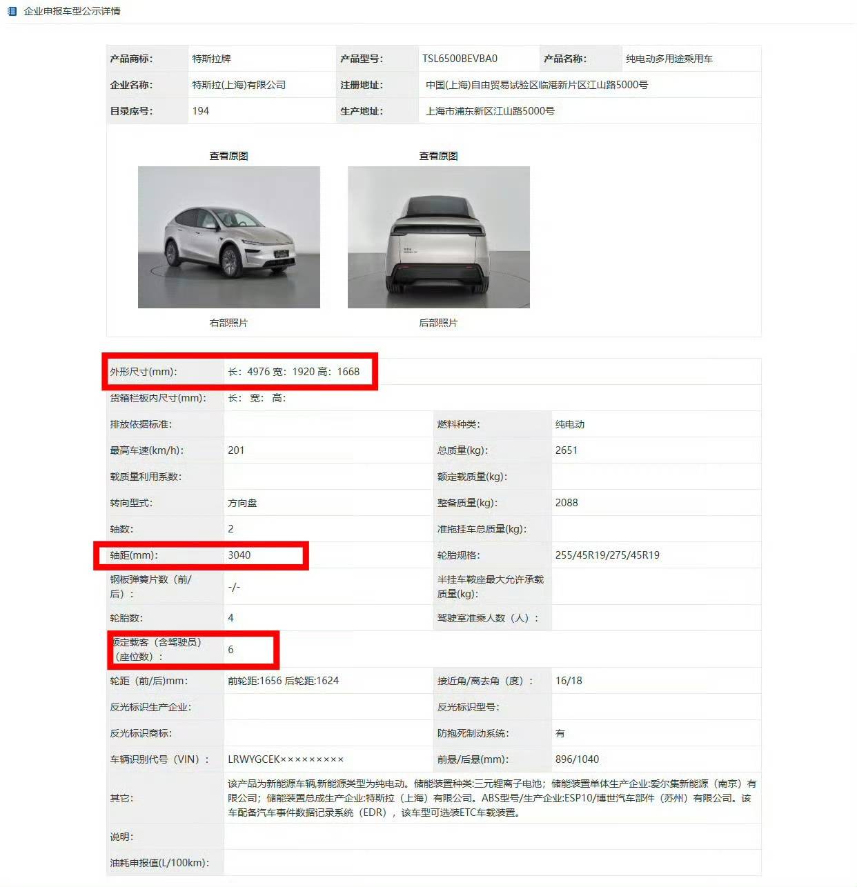 Model Y L長寬高為4976×1920×1668mm,軸距3040mm;相比現款Model Y(4797×1920×1624mm,軸距2890mm),車長增加179mm,軸距加長150mm,高度提升44mm。