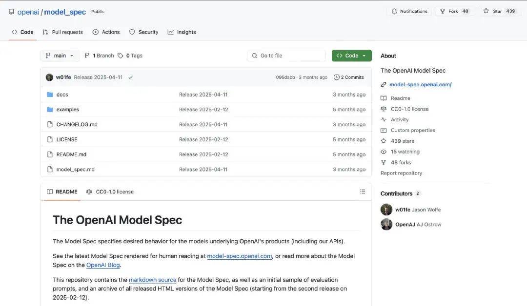 這份規范在今年二月完成了更新和開源,現在大家可以訪問 GitHub 查看模型規范的具體實現( https://github.com/openai/model_spec)。但意外的是,我看到的只是一大堆 Markdown 文檔。我不是說 Markdown 這種格式不好,它易于閱讀、支持版本控制,還包含變更記錄。而且因為是自然語言,每個人都可以為它做出貢獻,包括產品、法律、安全、研究和政策人員。他們可以閱讀、討論、辯論并為源代碼做出貢獻。這樣一來,大家就能圍繞同一套意圖和價值取向保持統一。
