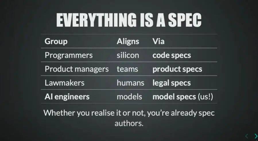 這其實是個非常普遍的概念。程序員的工作是通過代碼規范來協調芯片,產品經理通過產品規范來協調團隊。立法者實際是通過法律規范來協調人類。在座的各位,當我們輸入提示詞時,這代表的就是一種原型規范,其目的就是讓 AI 模型向著你預設的意圖和價值取向邁進。正是這種規范,讓我們能夠更快、更安全地交付產品。而且每個人都可以為規范做貢獻——包括產品經理、立法者、工程師乃至市場營銷人員,現在大家都是程序員。