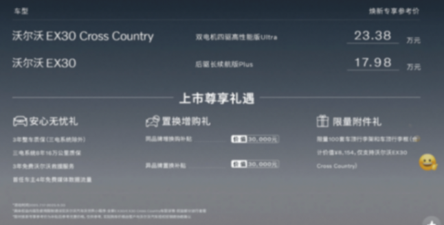 沃爾沃EX30 Cross Country,煥新專享參考價為23.38萬元(截止至2025年9月30日),官方建議零售價為26.38萬元。新車定位小型SUV,是沃爾沃EX30的跨界越野版本。在整體造型上加入了更多越野風格元素,采用雙電機布局,匹配容量為66kWh的三元鋰電池組,CLTC工況續(xù)航里程為540km。