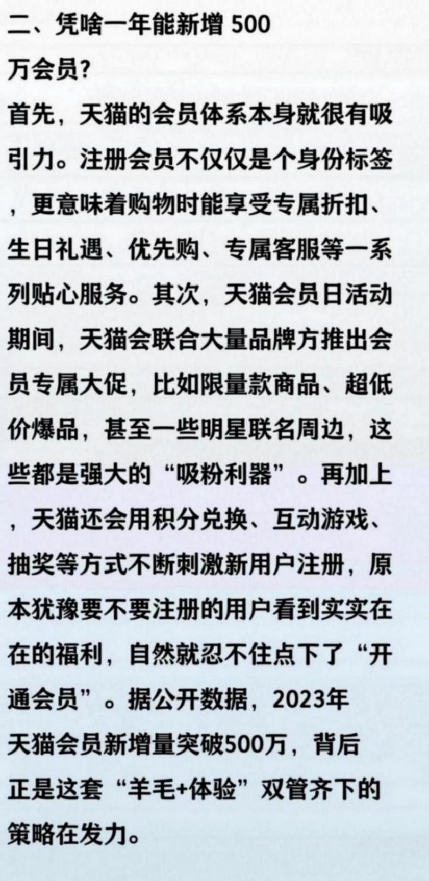 天貓會員日最近太火了,不光吸引了500萬新會員,還讓2000多萬老會員都忍不住“剁手”。其實說白了,大家都愛占點小便宜,天貓各種專屬優惠、會員福利真挺有吸引力的。再加上玩法新花樣多,買東西還能攢積分換禮物,誰能不心動?我覺得天貓就是抓住了咱們追求實惠和新鮮感的心理。