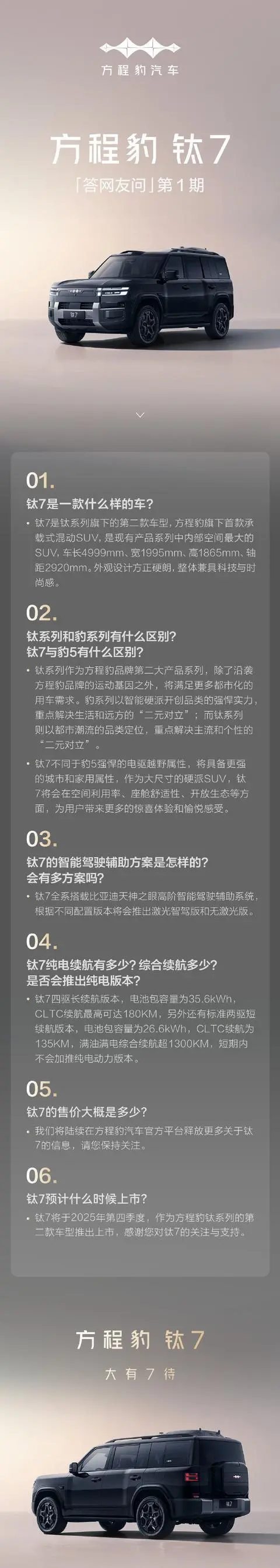 7 月 19 日消息,比亞迪方程豹昨晚發(fā)布“鈦 7 答網(wǎng)友問第 1 期”,針對(duì)新車的部分信息以及上市時(shí)間進(jìn)行了披露。