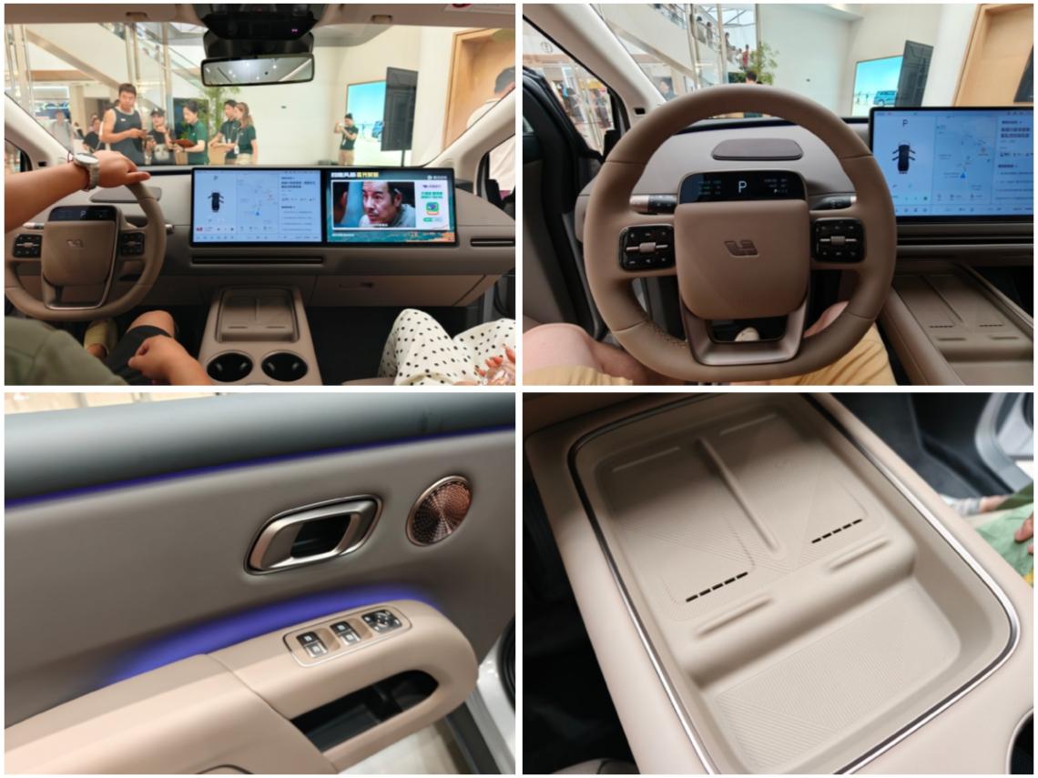 5、主駕前面增加了一個揚聲器和互動氛圍燈,雙聯屏在前IP臺更接近嵌入設計,HUD尺寸應該沒有變化,無線充電面板依然沒有植絨設計。整個前艙最大的問題是配置變化不大,相比最近體驗過的60英寸HUD、17.3英寸大屏這些更有分量感的前艙配置,覺得略顯小氣。