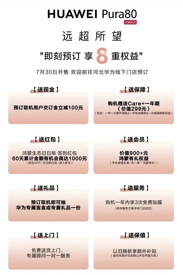 據(jù)線下門店信息顯示,預(yù)訂用戶可享受8大超值權(quán)益:包括預(yù)訂取機(jī)用戶交訂金立減100元、購機(jī)贈價(jià)值299元的一年期HUAWEI Care+服務(wù)、購機(jī)一年內(nèi)享3次免費(fèi)貼膜服務(wù)、優(yōu)先取機(jī)權(quán)、專屬配件禮包、以舊換新補(bǔ)貼、延長保修服務(wù)以及會員積分加倍等多項(xiàng)福利。
