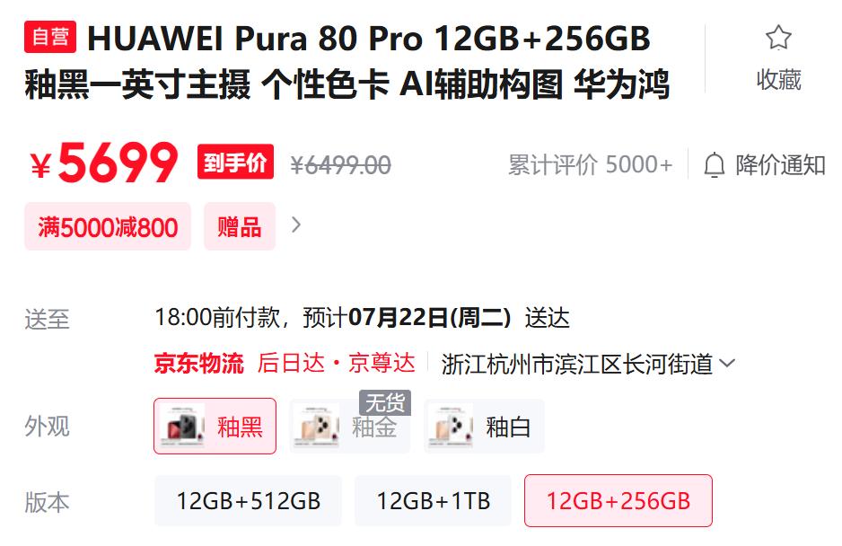 在此之前,在線上平臺,華為針對Pura 80 Pro/Pro+這兩款機(jī)型推出了限時(shí)優(yōu)惠活動,滿5000元立減800元,使得Pura 80 Pro起售價(jià)降至5699元(12GB+256GB版本),國補(bǔ)后低至5199元起。