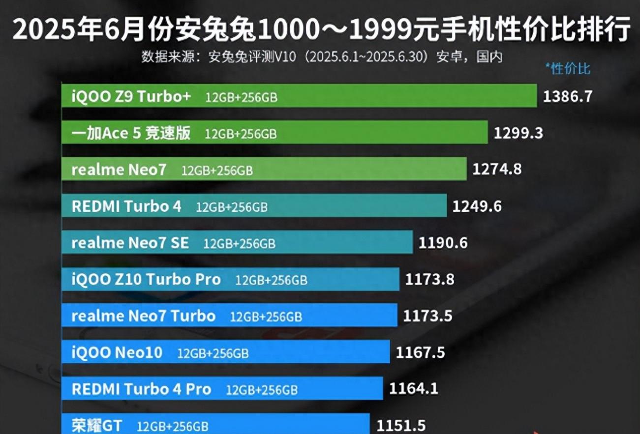 近日,根據(jù)多家科技媒體的消息,國內手機評測機構安兔兔公布了2025年6月份1000—1999元安卓手機性價比排行榜。按照介紹,性價比排行榜是安兔兔把手機的平均跑分和售價進行比較,得出的一個榜單,比較關注性價比的朋友可以參考一下。沒出現(xiàn)在榜單上,不代表機型性價比不高,安兔兔表示希望用自己的數(shù)據(jù)給大家選手機做參考,但數(shù)據(jù)是有局限性的。