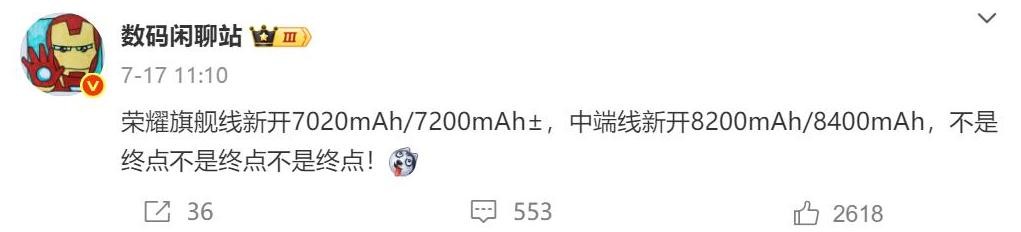榮耀又放大招了!他們出了一款7300mAh電池的手機榮耀x70。這才剛開始呢,聽說他們還要推更猛的8400mAh電池。爽吧?一個叫數碼閑聊站的博主說,榮耀的中端手機線要上8200mAh或8400mAh電池。旗艦手機線也要搞7020mAh或7200mAh電池。這些新手機估計今年下半年就能買到。