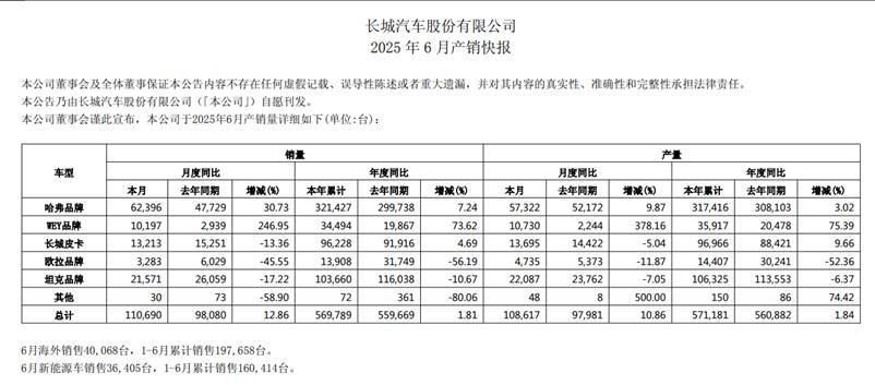 數(shù)據(jù)顯示,今年上半年,長城汽車總銷量達(dá)56.98萬輛,較去年同期微增1.81%。新能源車型表現(xiàn)突出,貢獻(xiàn)了16.04萬輛的銷量,占總銷量的28.2%。其中,哈弗品牌累計銷量32.14萬輛,同比增長7.24%;魏牌銷售3.45萬輛,同比增長73.62%;長城皮卡累計銷量9.62萬輛,同比增長4.69%;歐拉品牌銷量同比下滑56.19%至1.39萬輛;坦克品牌銷售10.37萬輛,同比下降10.67%。