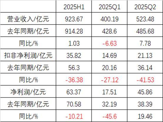 其中,2025年第一季度營業(yè)收入400.19億元,同比下降6.63%;扣非凈利潤14.69億元,同比下降27.12%。2025年第二季度營業(yè)收入523.48億元,同比增長7.78%;扣非凈利潤21.13億元,同比下降41.53%。