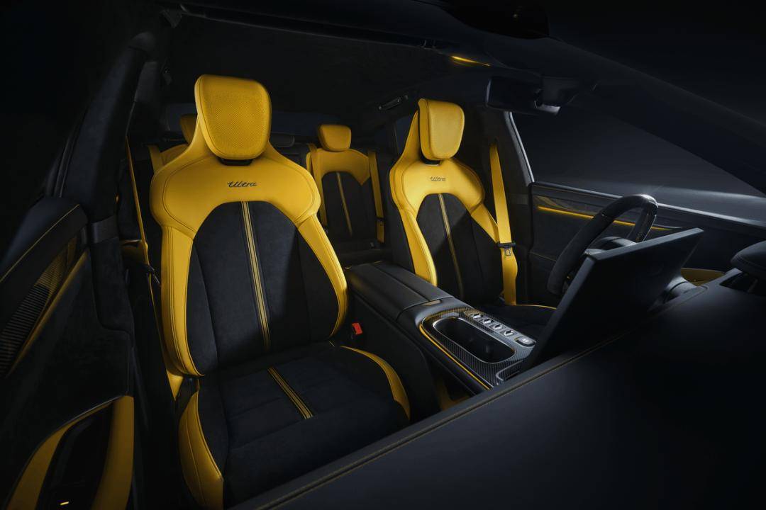 SU7 Ultra采用Alcantara超細纖維面料(包覆面積超5m²)和碳纖維飾板,標配運動座椅(帶主動側翼支撐及賽道刺繡條紋),提供明黃、黑/黃雙色等內飾配色。SU7 Ultra配備16.1英寸3K中控屏、56英寸HUD及后排雙Pad,支持五屏聯動,UI界面融入電音、科幻等運動主題。SU7 Ultra標配Xiaomi HAD全場景智駕,搭載128線激光雷達、3顆毫米波雷達及雙Orin-X芯片(總算力11.45EFLOPS),支持端到端大模型,覆蓋自動泊車、高速領航等場景。截至2025年2月,已積累超1000萬Clips場景數據,并聯合保險公司提供智駕保障服務。