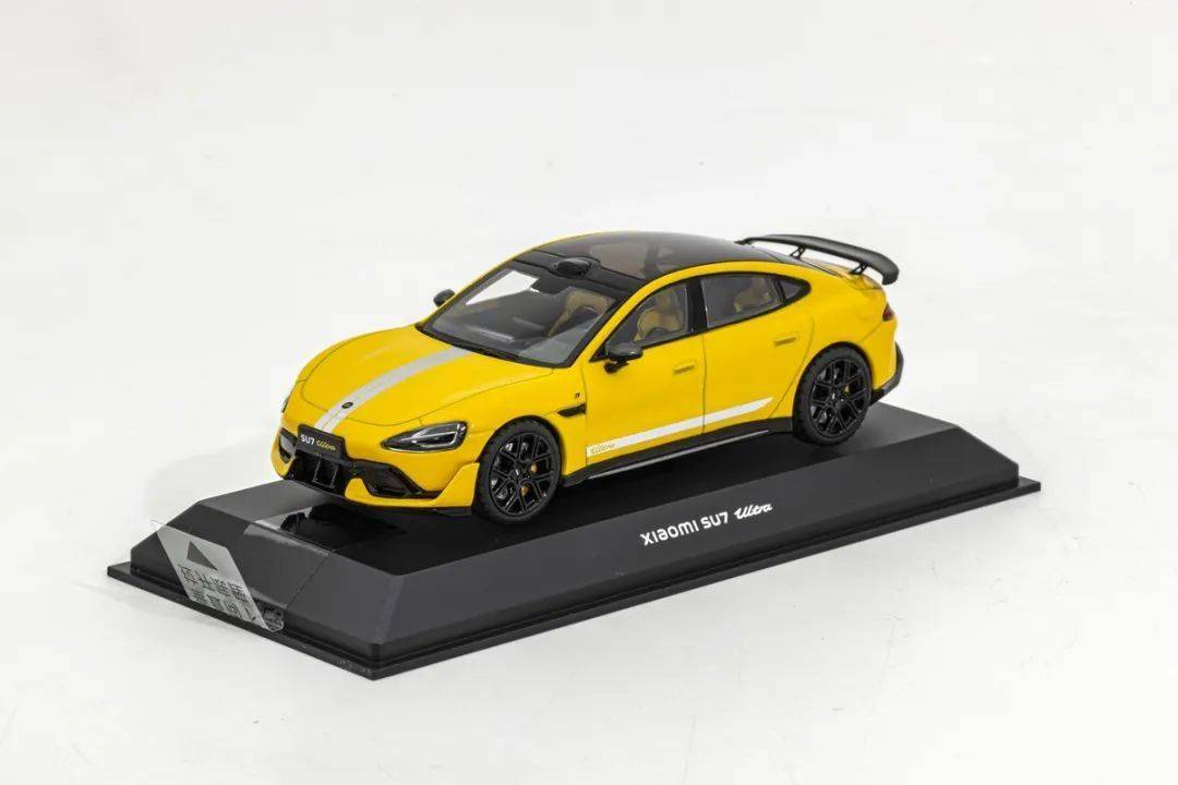 因為這款是小米官方模型,能得到真車外形的原廠數據,因此形準這點上我們是基本不用擔心的;模型的整體比例均衡,縫隙刻線水準還不錯;黃色漆面均勻度也是非常不錯的,模型的車頂為透明天窗(帶可調節玻璃,其實就是深色透明玻璃),車身從前蓋到后蓋中央都有銀色條紋,側面也有印色條紋,還有鏤空出SU7 ULTRA標志;模型的車門把手為浮雕刻畫,車外后視鏡是獨立分件的,而且做了碳纖維;前翼子板后側裝飾塊是浮雕的,但做得還算細膩;車窗邊框浮雕刻畫,黑色分界很清晰,B柱也是浮雕的,有立體感;模型的尾翼也是獨立分件的,尾翼支架應該是金屬材質,比較精細;側包圍是黑色的,貌似是獨立分件,還有一條碳纖維飾條,車頭的側風刀也是鏤空的,后包圍貌似還是獨立分件的。