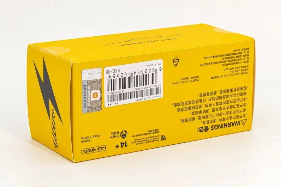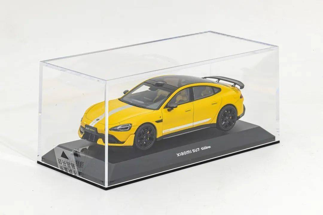 小米的這款SU7 ULTRA模型的包裝采用黃色(車身同色)的開口紙盒,產品配了塑料底座和亞克力罩,包裝外還有牛皮紙盒,這點和保時捷和奧迪的原廠1/43車模很像,看來小米在模型設計上也參考歐洲品牌。