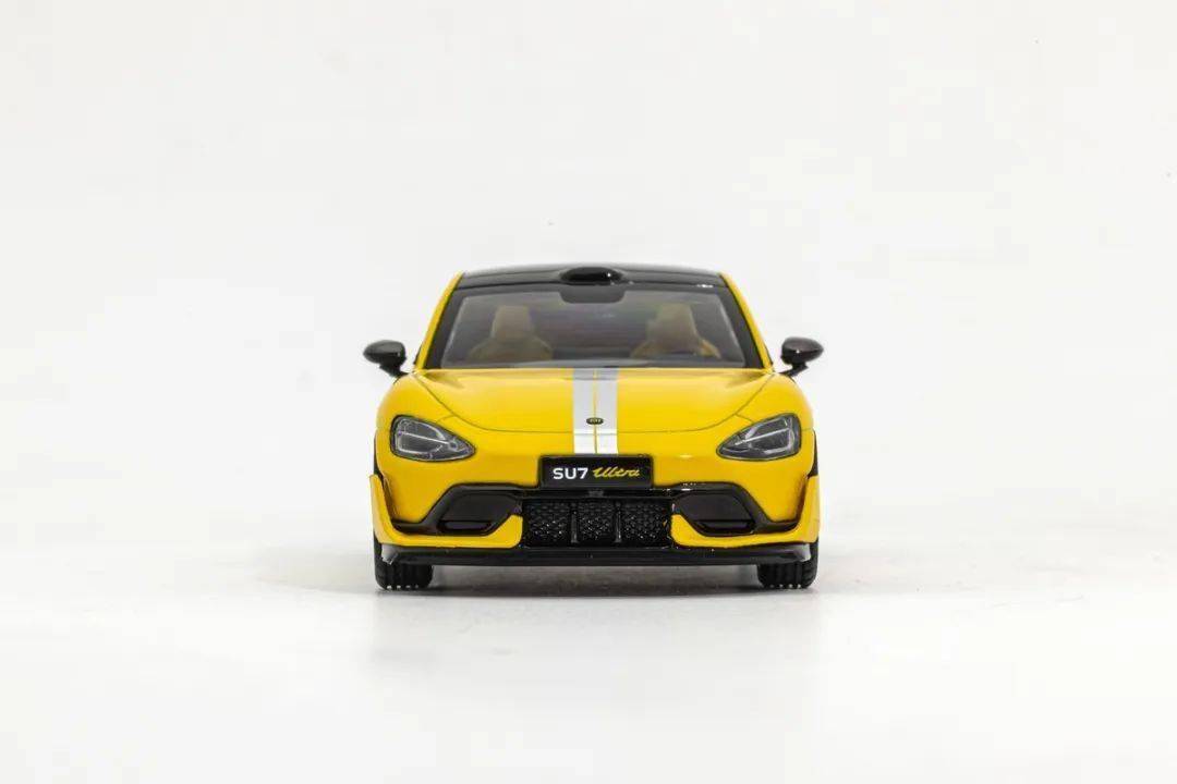 小米SU7 ULTRA模型采用黃色的漆面,漆面為素漆,整體表現都還算穩定,還有銀色條紋;模型的內飾以黑色為主,有部分油漆刻畫的內飾細節,座椅也做了分色處理;模型的前雨刮是塑料獨立件,做得比較精致;模型的車頂為全玻璃天窗設計,前后都有雷達。