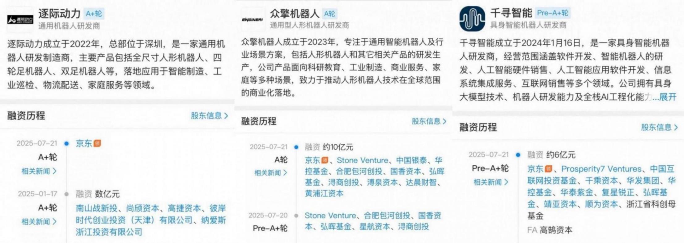 7月21日,眾擎機器人發布的消息稱,今年7月,公司正式完成兩輪融資,金額近10億元。其中,A1輪融資由京東領投;同樣在21日,千尋智能宣布,近日公司完成近6億元Pre-A+輪融資,由京東領投;逐際動力同日發布消息稱,公司新一輪融資獲京東戰略領投,金額沒有詳細披露。