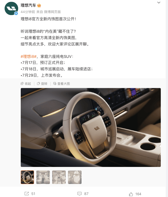 近日,從理想汽車官方獲得一組理想i8內飾官圖。據悉,新車定位為純電中大型SUV,新車將于7月17日開啟預訂,7月29日上市。新車預計售價有望在35萬元以上。下面,和大家一起來看看新車的產品力如何?
