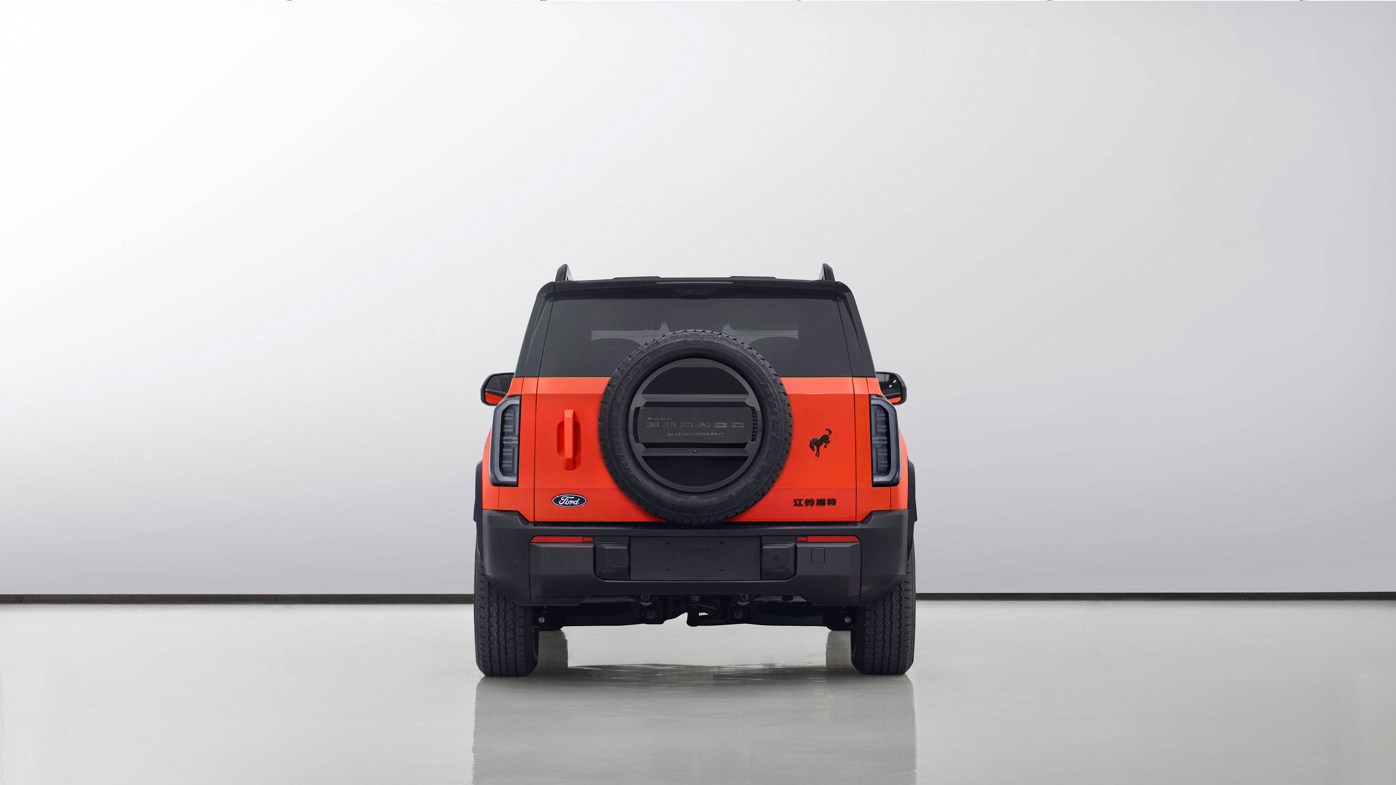 車尾是左側側開門設計,中間是外露的備胎。兩側采用豎狀大燈,都是標準的硬派越野設計。值得一提的是,全車僅有的福特藍色橢圓Logo在拉手下方,另一側則是烈馬Logo。整個車尾硬派十足,卻不乏細節(jié)。