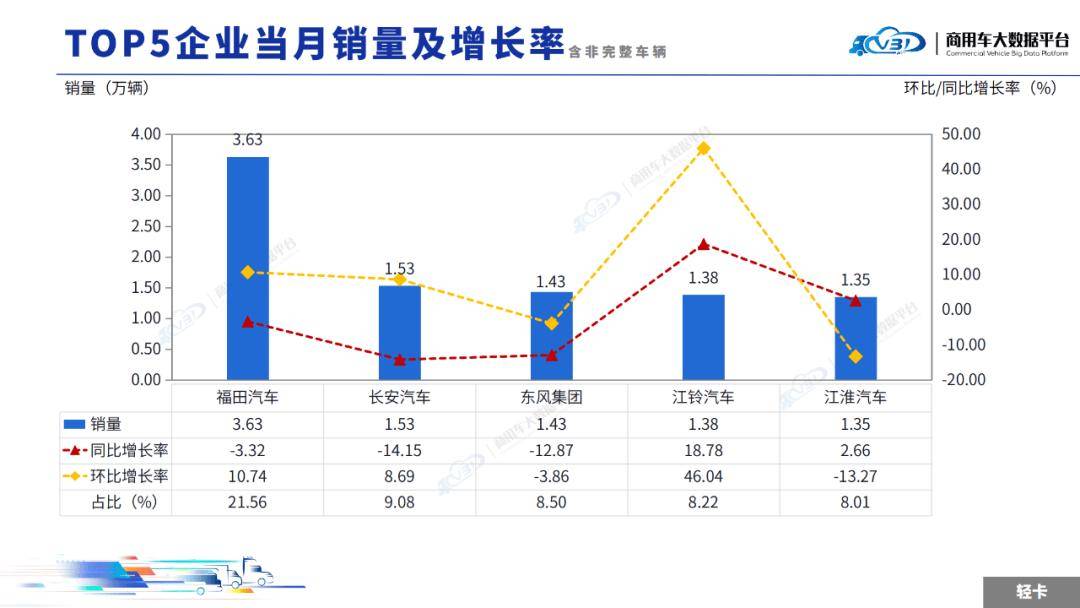 當(dāng)月輕型卡車銷量TOP5企業(yè)占比55.37%,依次為福田汽車、長安汽車、東風(fēng)集團(tuán)、江鈴汽車、江淮汽車。