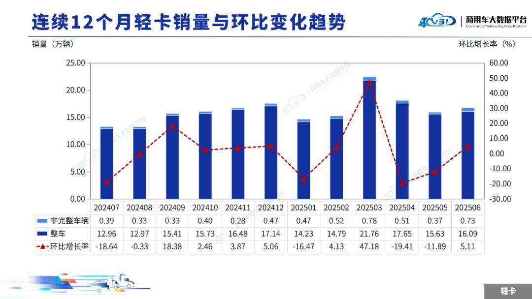 2025年6月全國輕型卡車銷量(批發(fā))為16.82萬輛,同比增長2.57%,環(huán)比增長5.11%。1-6月,累計(jì)銷量(批發(fā))為103.55萬輛,同比增長7.24%。