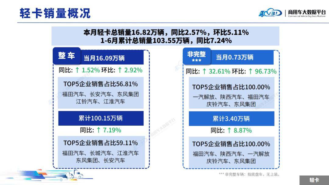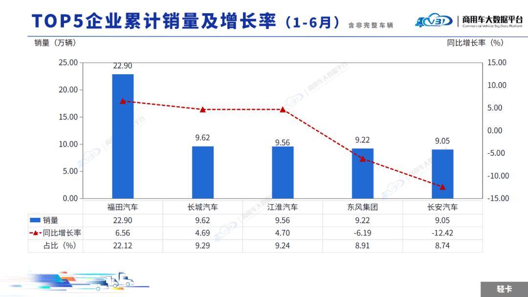 1-6月輕型卡車?yán)塾?jì)銷量TOP5企業(yè)占比58.3%,依次為福田汽車、長城汽車、江淮汽車、東風(fēng)集團(tuán)、長安汽車。