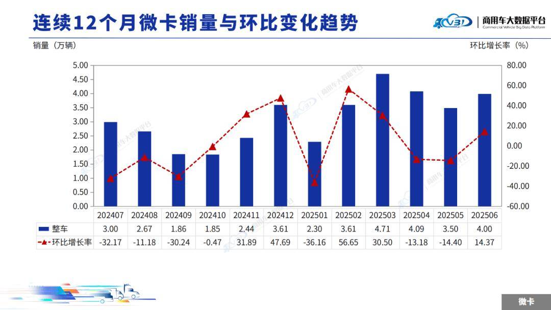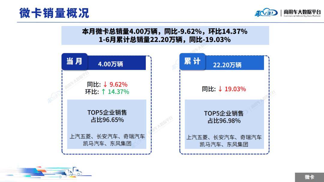 2025年6月全國微型卡車銷量(批發(fā))為4.00萬輛,同比下降9.62%,環(huán)比增長14.37%;1-6月,累計(jì)銷量(批發(fā))為22.20萬輛,同比下降19.03%。
