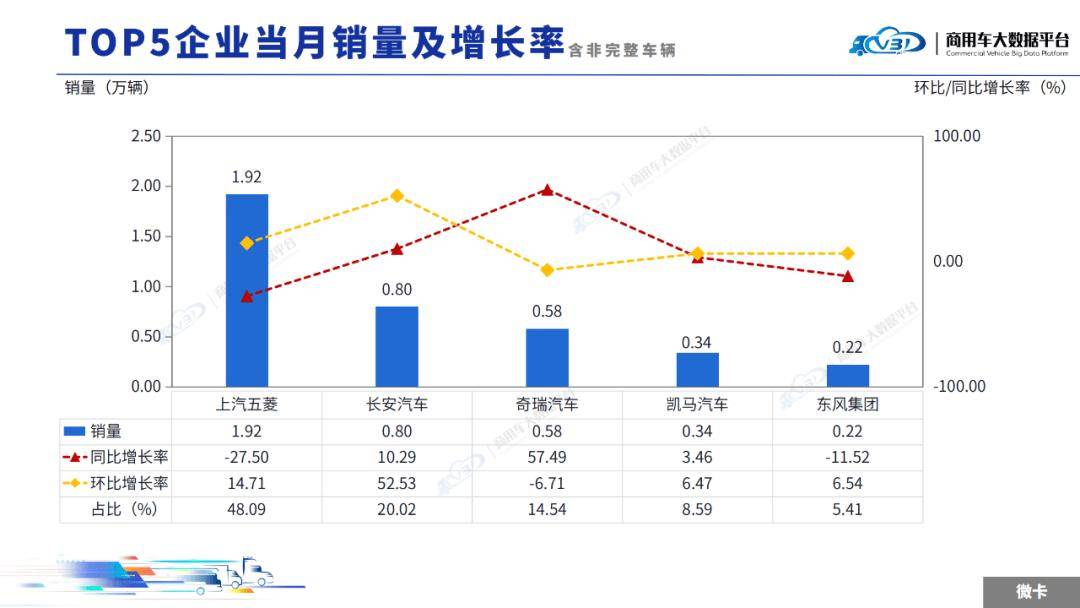 當(dāng)月微型卡車銷量TOP5企業(yè)占比96.65%,依次為上汽五菱、長安汽車、奇瑞汽車、凱馬汽車、東風(fēng)集團(tuán)。