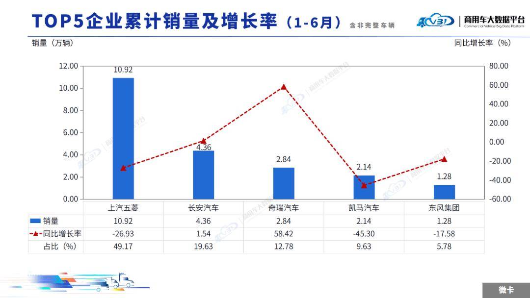 1-6月微型卡車?yán)塾?jì)銷量TOP5企業(yè)占比96.99%,依次為上汽五菱、長安汽車、奇瑞汽車、凱馬汽車、東風(fēng)集團(tuán)。