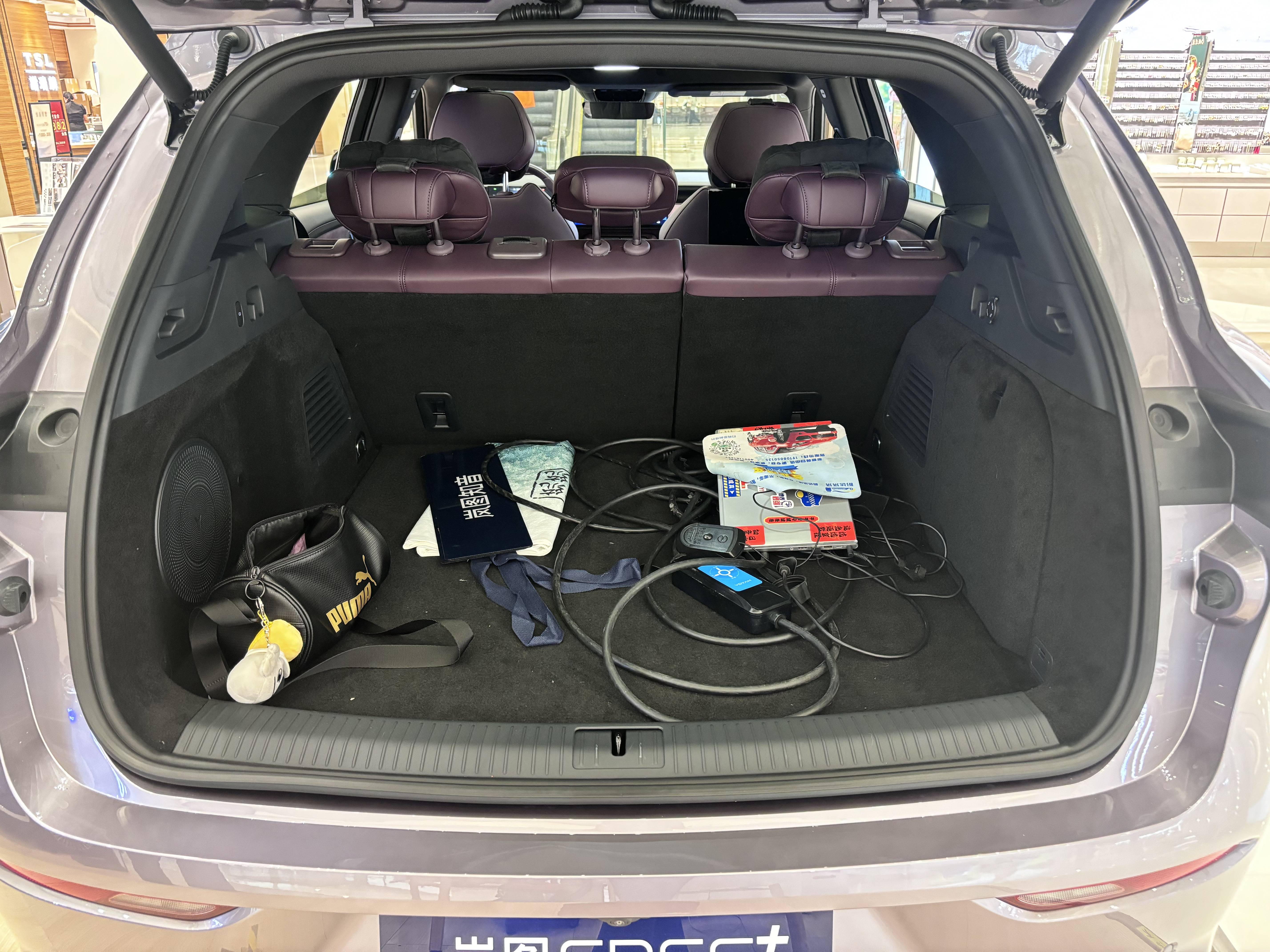 8. 后備箱常規容積590升,日常放行李廂、購物袋夠用。二排座椅支持電動放倒,放倒后裝載空間可擴展至1450升,搬運大件物品甚至臨時搬家均可應付。