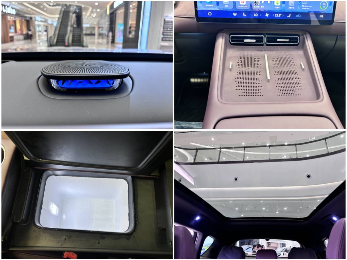 5. 配置誠意足,三輻式方向盤握感舒適;HUD抬頭顯示、無線充電板、7L冷暖冰箱全系標配。其中冷暖冰箱可放6瓶水,支持-6℃-50℃調溫。全景天幕帶遮陽簾,對怕曬人群(尤其女性)友好。