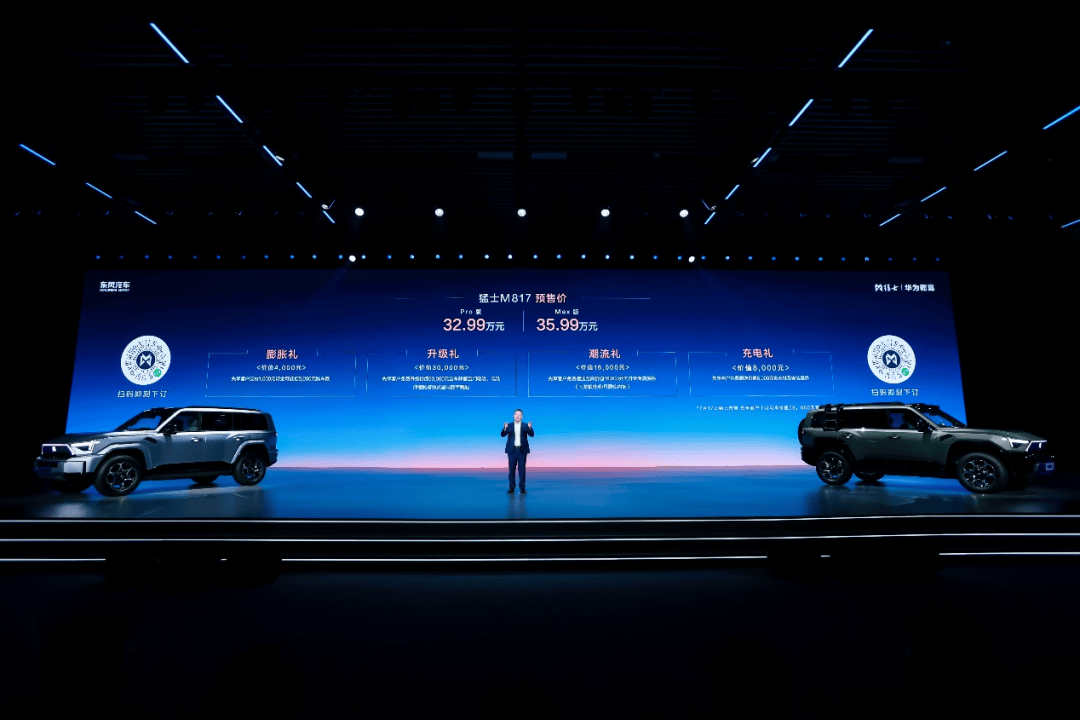 7月17日,東風猛士在武漢舉行猛士M817預售發布會,新車共推出兩個版本,Pro版預售價為32.99萬元,Max版預售價為35.99萬元。