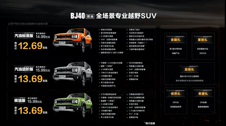 2025年7月19日,北京越野BJ40燃油正式上市,共推出3款車型,售價為14.99萬至15.99萬,煥新價為12.69萬至13.69萬元。新車外觀與內飾與現款車型保持一致,依舊定位緊湊型SUV。新款車型重點對配置進行升級,全系標配牽引資質、增加車頂行李架功能,強化了越野實力;全景天窗、皮質座椅的配置也進一步提升了新車的質感和舒適度。