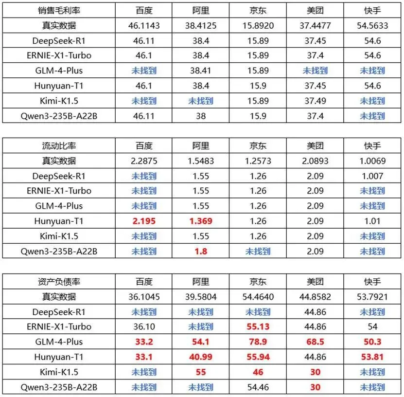 對(duì)于銷(xiāo)售毛利率,尚有DeepSeek-R1、ERNIE-X1-Turbo和Hunyuan-T1能夠獲取五家公司的全部正確數(shù)據(jù)。