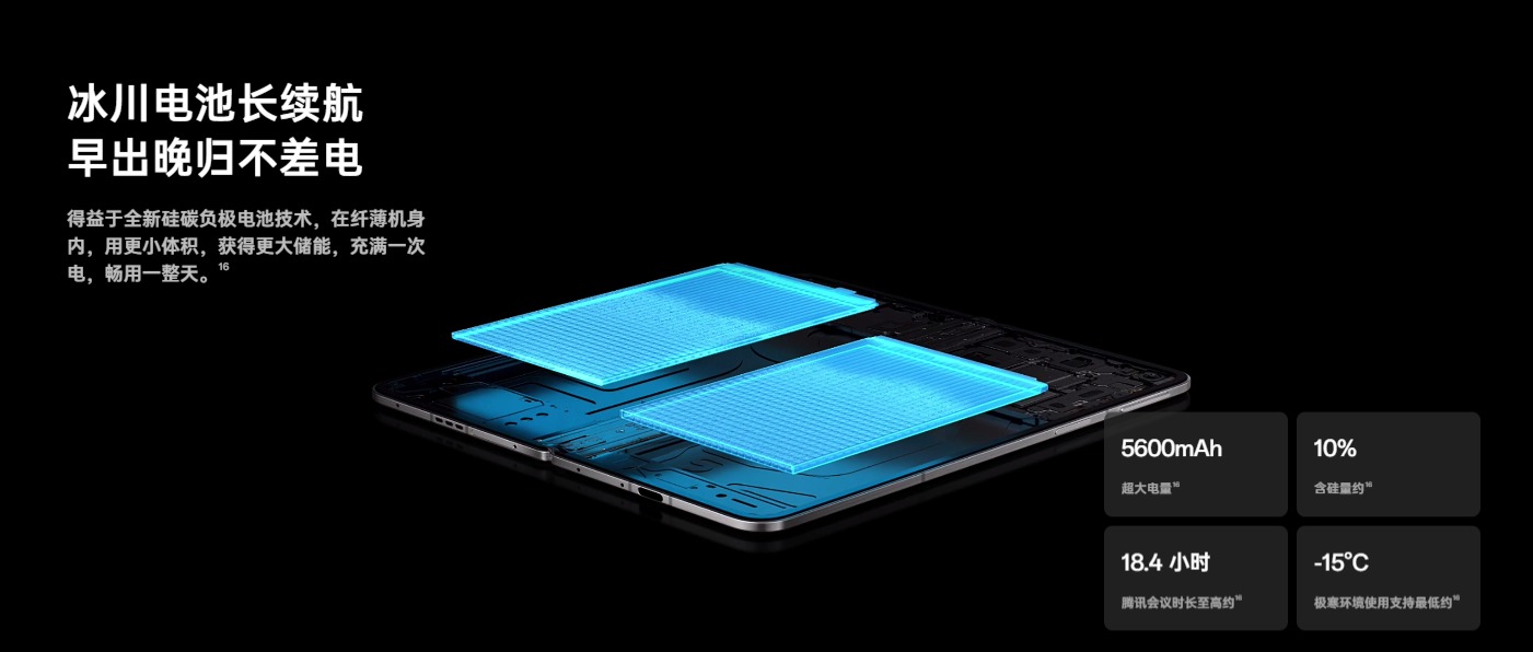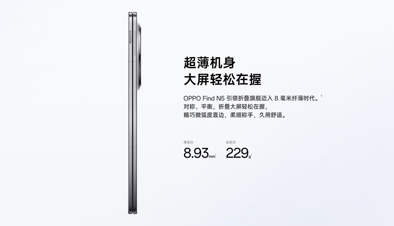 塞下旗艦性能后,輕薄也沒落下,OPPO Find N5閉合厚度僅為的8.93mm。媲美直板旗艦手感。其創新的"天穹架構"采用3D打印鈦合金鉸鏈,在減薄26%的同時提升36%剛性,屏幕展開幾乎無折痕。經過20萬次折疊測試仍保持平整,重新定義了輕薄與耐用的平衡。