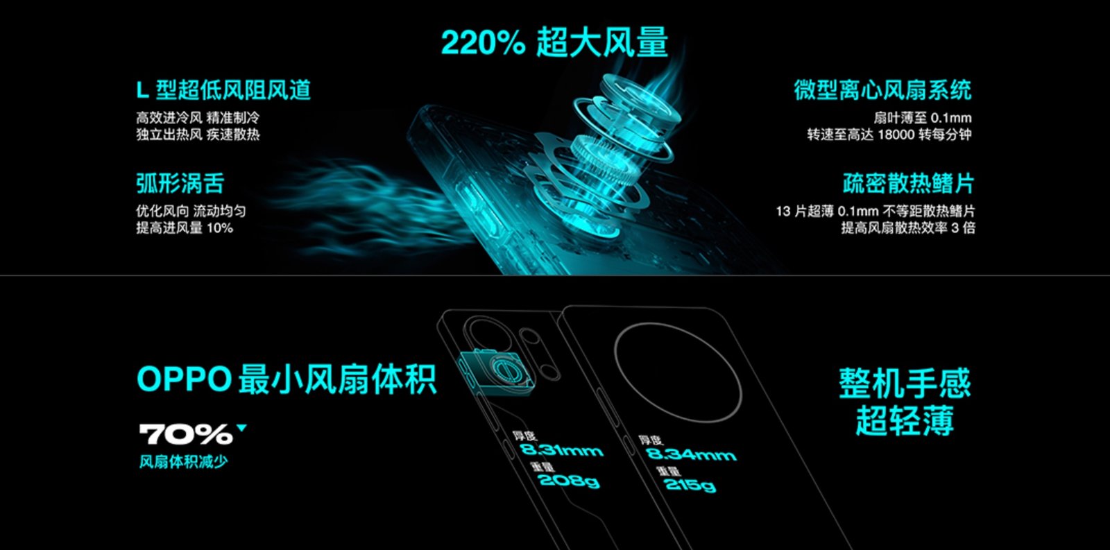 OPPO K13 Turbo 系列的主動散熱風(fēng)扇擁有 18000 轉(zhuǎn)每分鐘的轉(zhuǎn)速,配合 L 型超低風(fēng)阻風(fēng)道設(shè)計以及疏密散熱鰭片,讓散熱更高效。散熱風(fēng)扇的體積也非常小,這也讓 OPPO K13 Turbo 系列的機身厚度控制在了 8.31mm,重量也僅有 208g,超強散熱也能有輕薄手感。