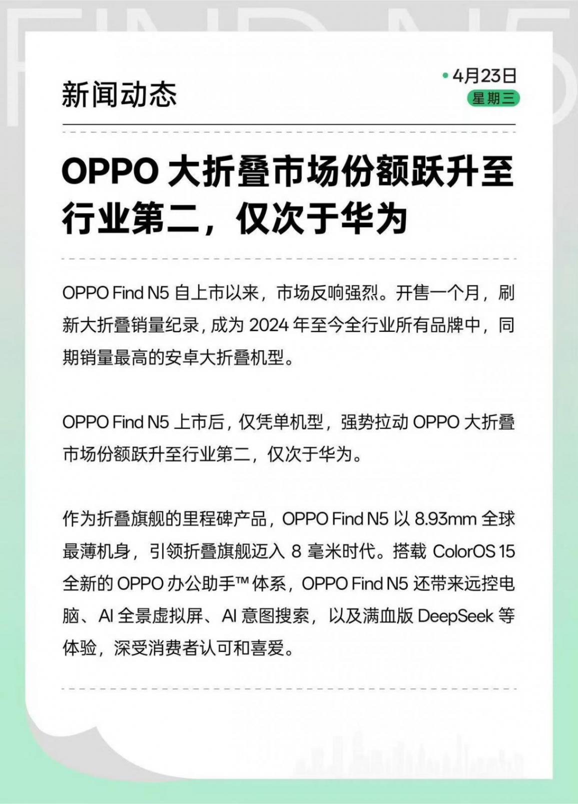 而另一位“高端明星”——OPPO Find N5,更是折疊屏市場的黑馬代表。憑借8mm極限輕薄、鈦合金天穹鉸鏈、驍龍8至尊版、滿級防水、50W無線閃充等一攬子“真旗艦”配置,它在上市首月即刷新了大折疊安卓陣營的銷量紀錄,推動OPPO折疊屏市占率躍居行業(yè)第二,僅次于華為。